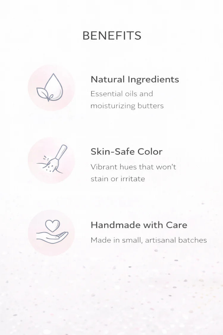 All our ingredients are 100% natural and Cosmetic grade or plant-based, except for our use of certified organic FD&C pigments.